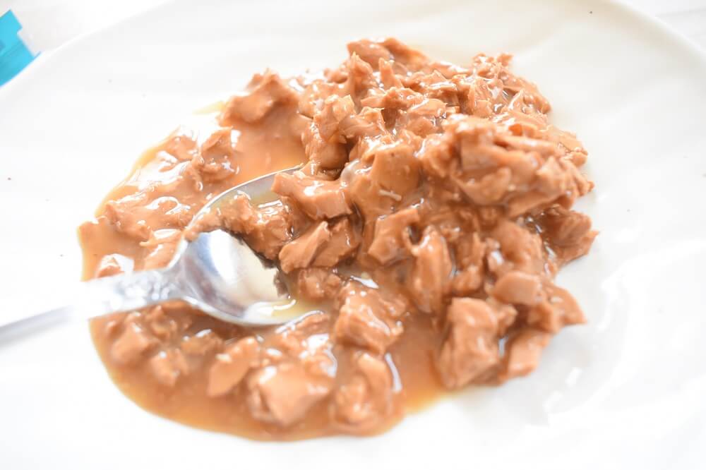 ウエットフードのなかでも見た目的に水分が多めですね。水分が多く含まれていると、猫の尿路疾患の予防になるので嬉しい工夫です。