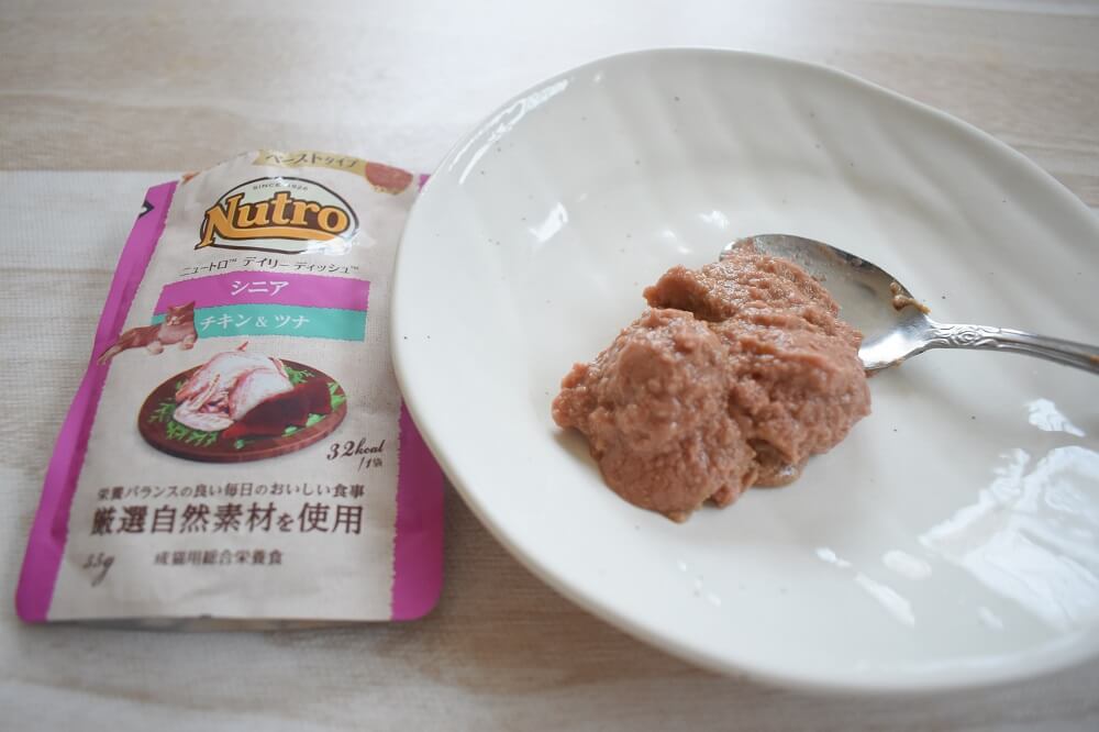 ニュートロのシニア用フードは、水分量が多いペースト状です。